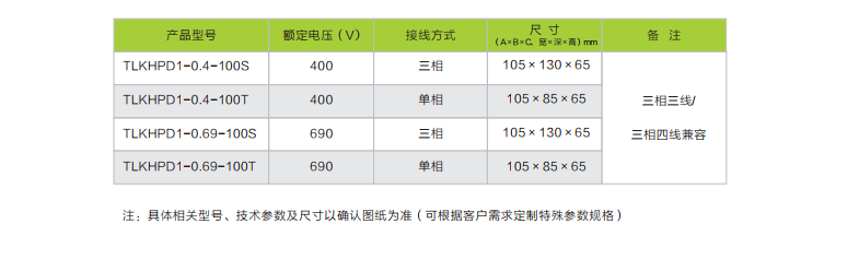 例如:TLKHPD1-0.48-100T代表特朗克品牌谐波保护器,普通型的、0.48KV、100A的三相谐波 保护器。