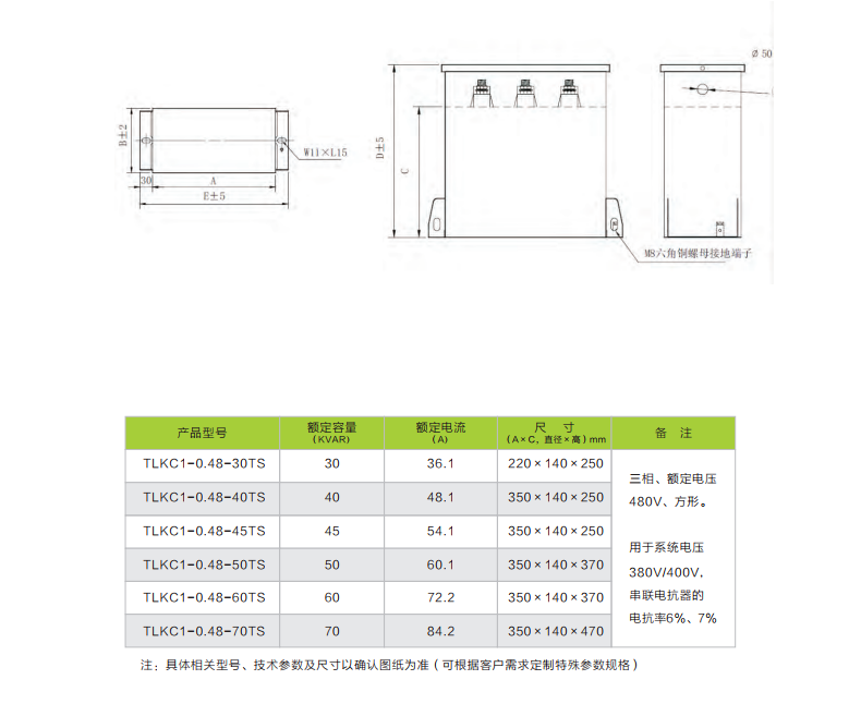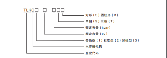 例如:TLKC1-0.48-30TB代表特朗克品牌低压并联电力电容器,普通型的、0.48KV、30Kvar的 三相圆柱形电容器。