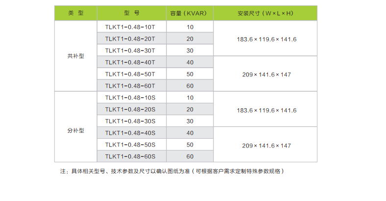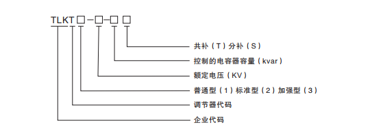 例如:TLKT1-0.48-30T代表特朗克品牌低压晶闸管调节器,普通型的、0.48KV、控制电容器的容 量为30Kvar的共补调节器。