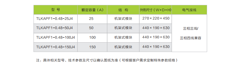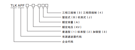 例如:TLKAPF1-0.48-100J4代表特朗克品牌低压有源滤波器,普通型的、0.48KV、100A的 机架式三相四线制低压有源滤波器。