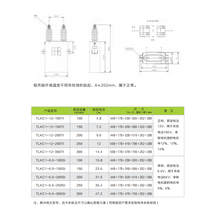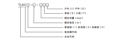 例如:TLKC1-11-100TI代表特朗克品牌高压并联电力电容器,普通型的、11KV、100Kvar的 三 相、户内型的电容器。