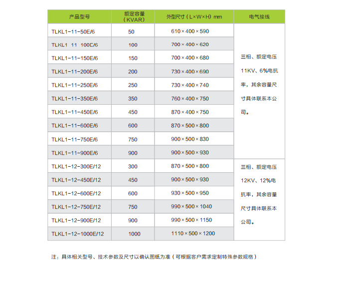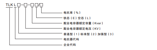 例如:TLKL1-11-100E/6代表特朗克品牌高压串联铁芯电抗器,普通型的、11KV、配合电容器额定 容量100Kvar的铁芯6%电抗率的电抗器。